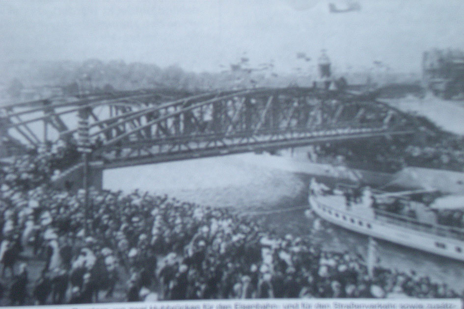 Im Hintergrund die Hub-Brücken für Eisenbahn und Straßenverkehr, die saniert werden. Dazu einige interessante Details über die Brücke in einem Zeitungsartikel ( hier) |