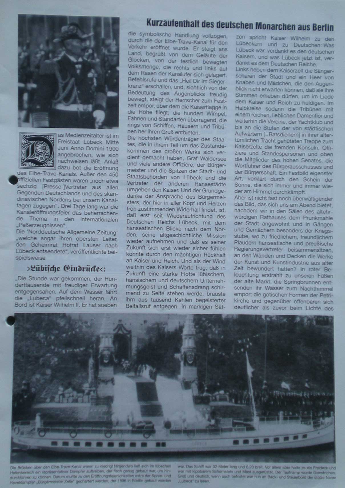 Diese sahen dann so aus: "Den Glanzpunkt des Ganzen bildete die am Irrgarten errichtete halbkreisförmige Tribüne mit dem vorgebauten Kaiserpavillon. Breite Stufen zwischen Blumenkörben tragenden Pfeilern führten zu dem tempelartigen Bau hinauf, über dessen Haupteingang die Wappenfelder Lübecks und Preußens in abwechselnder Wiederholung sichtbar waren. Ein dunkel-rother Sammetbaldachin und gelbleuchtende Behänge mit schweren goldenen Quasten, sowie Fahnen und Wappengruppierungen ergänzten den weiteren Schmuck des Pavillons, über dem bei der Anfahrt Se.Majestät zu dem Hauptfestakt die goldgelbe Kaiserstandarte zu den Lüften emporstieg." Was dann auch geschah. Man hatte nach einem geeigneten Schiff Ausschau gehalten, auf dem im neuen Kanal gefahren werden konnte, um die Gäste mit dem Schiff zum Festplatz transportieren zu können. Die Lübecker Wasserfahrzeuge waren entweder zu unan- sehnlich oder hatten zu viel Tiefgang. Schließlich lieh man sich ein Schiff aus Berlin, das für den Festakt in Lubeca (Lübeck) [siehe Bild unten] umbenannt wurde. Der Kaiser kam mit dem Zug im damaligen Bahn- hof am Holstentor an, entstieg dem Waggon und wurde in festlich geschmückten Straßen in einem Festzug aus Kutschen bis zum Kaisertor gebracht, bestieg mit seinem Gefolge und den edlen Personen der Stadt das festliche Schiff, um damit bis zum Festplatz auf dem Wasserwege zu fahren. Dort wartete bereits die Menge der eingeladenen Gäste. Woraufhin der Festakt erfolgen konnte, durch den der Kanal eröffnet wurde. Um 18:00 Uhr verließ der Kaiser Lübeck und die zurückgebliebenen Festtagsgäste stürzten sich im Bürgerschaftssaal auf ein Festbankett. Na bitte. Damit hatte sich das Warten gelohnt. Es waren heftig viele Bürger der Stadt unter polizeiliche Kontrolle gestellt worden, damit an diesem Tage alles recht festlich verlief. Diese Bürger hatten natürlich keinen Zugang zu dem Rathaus, das "an den Marktfronten mit rothgoldenen Teppichen und Guirlanden, Fahnen und Wappen geschmückt" war. Sie mußten 'als arme Hunde' draußen bleiben. Hunger genug werden sie ja wohl gehabt haben. Schade, dann wäre das Fest perfekt gewesen." [Originaltext auf folgender Internetseite : Website]