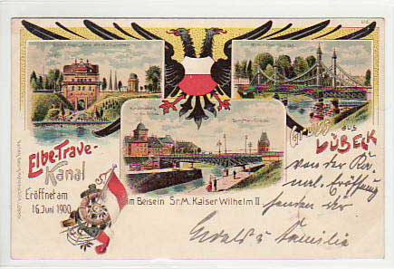 Postkarte mit der Aufschrift : "Zur Erinnerung zur Einweihung des Elbe-Trave-Kanals, 18. Juni 1900" |