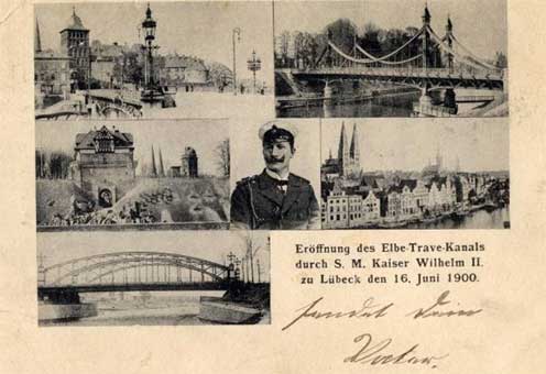 Postkarte zur Kanaleinweihung am 16. Juni 1900 mit der Burgtorbrücke, der Mühlenbrücke, dem Kaisertor, Wilhelm II., Obertrave und Rhederbrücke |