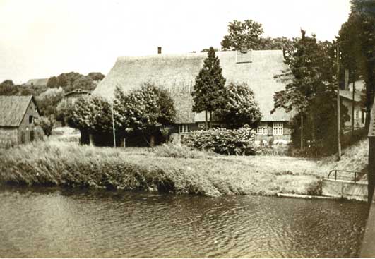 Das abgebrannte Haus der Familie Weidemann links neben der Krummesser Brücke vor 1900, |
