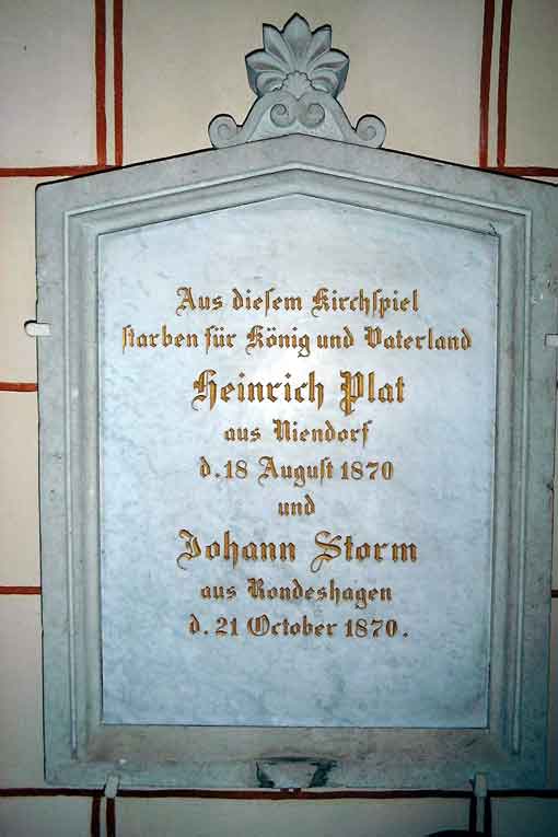 Gedenktafel, linke Seite des Kirchenschiffs, für den Rondeshagener Johann Storm, gefallen im deutsch-französischen Krieg, 1870 "Storm, Johann Heinrich Christian, Schleswig-Holsteinisches Füsilier Regiment Nr. 86, Füsilier, † bei Argenteuil am 21.10.1870, aus Rondeshagen" |