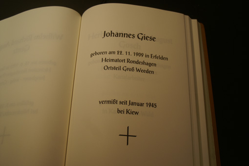 Rondeshagener Johannes Giese, im Buch der Weltkriegsgefallenen im Eingang der Kirche |