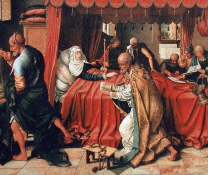 Was spätere Forschungen häufig als dämonenabwehrenden Akt deuteten. Hierbei schlägt sich die Frau an die Brust und zerreißt ihr Gewand, eine Geste, die heute noch in Süd- und Osteuropa anzutreffen ist. Im Augenblick des Todes verläßt die Seele den Körper (mens redit ad dominum), und ein Priester spendet die letzte Wegzehrung (viaticum).