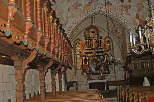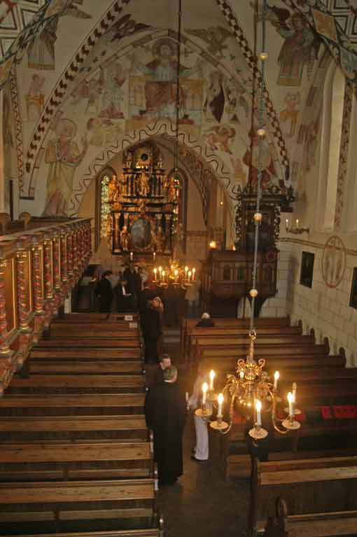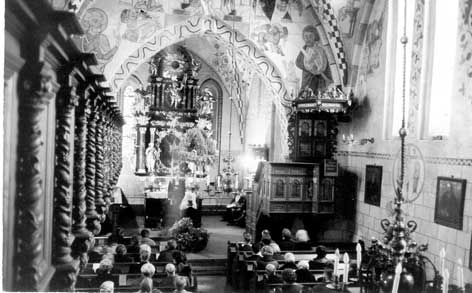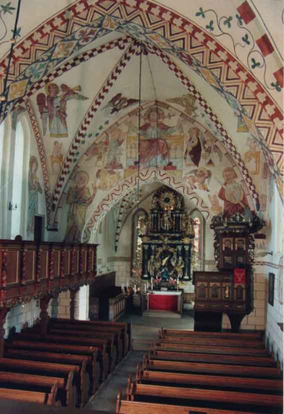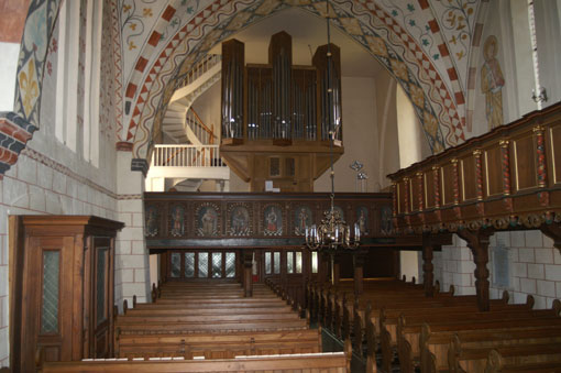 Blick vom Altar aus Richtung Orgel und der Empore mit neun Heligenbildern |