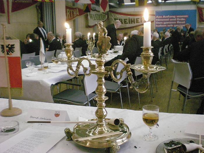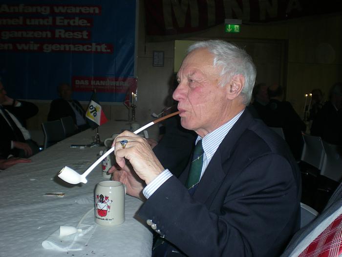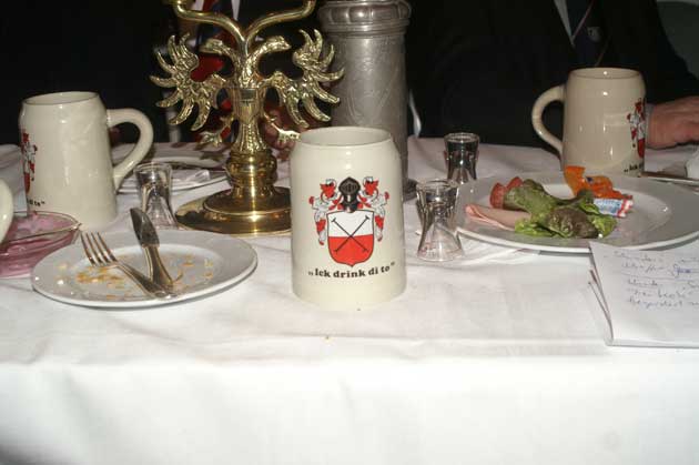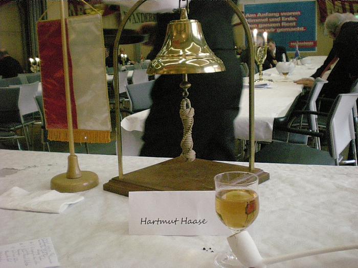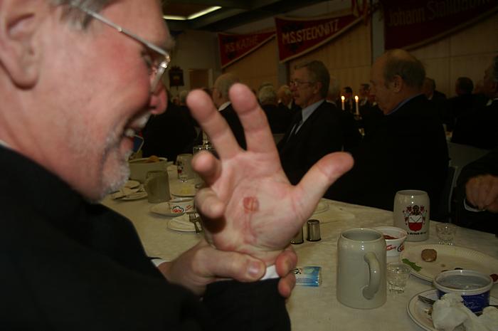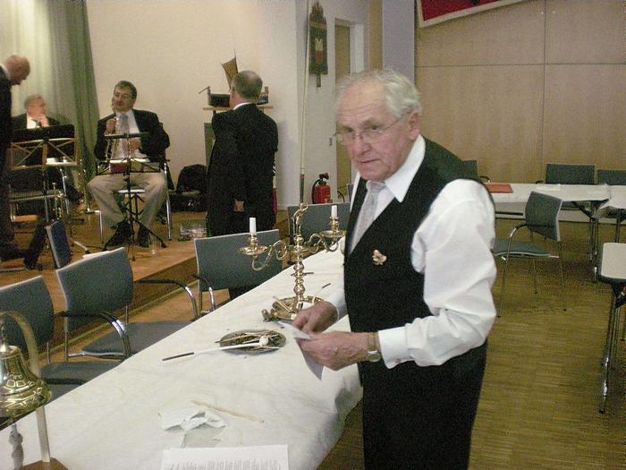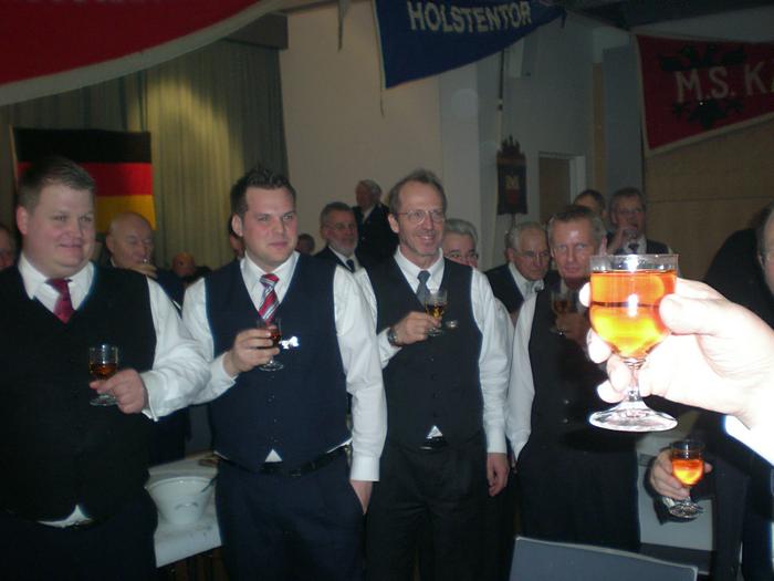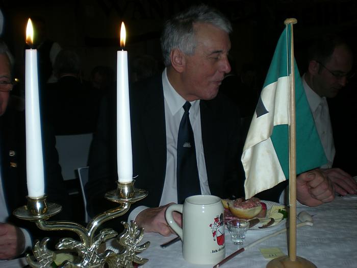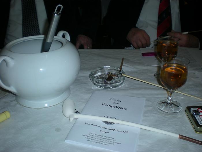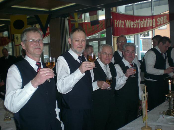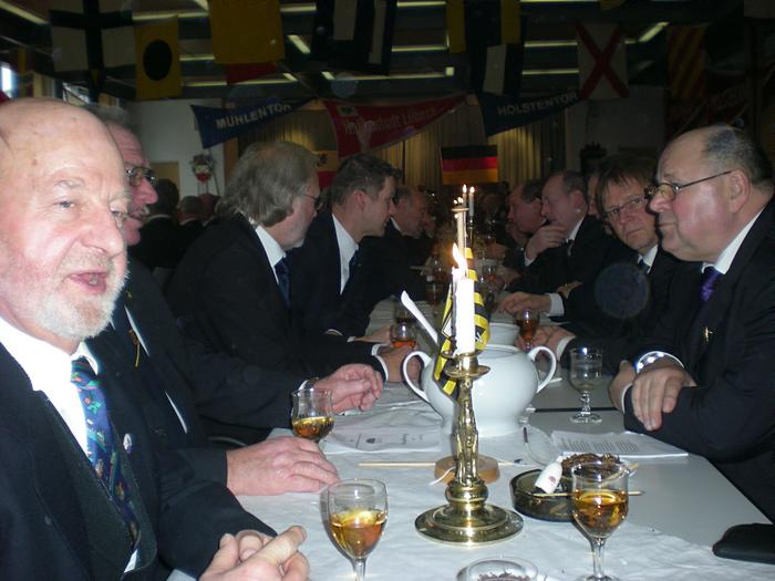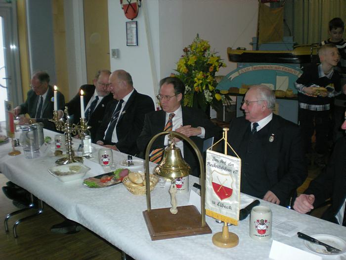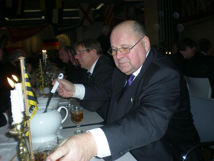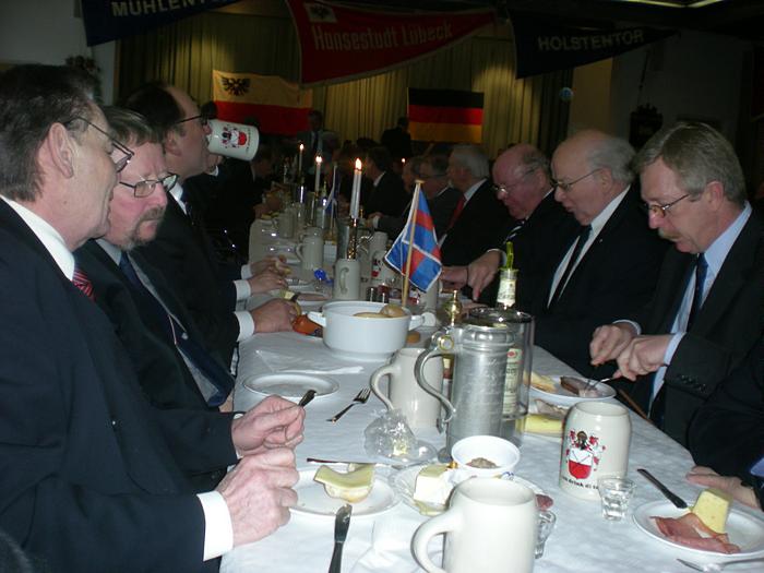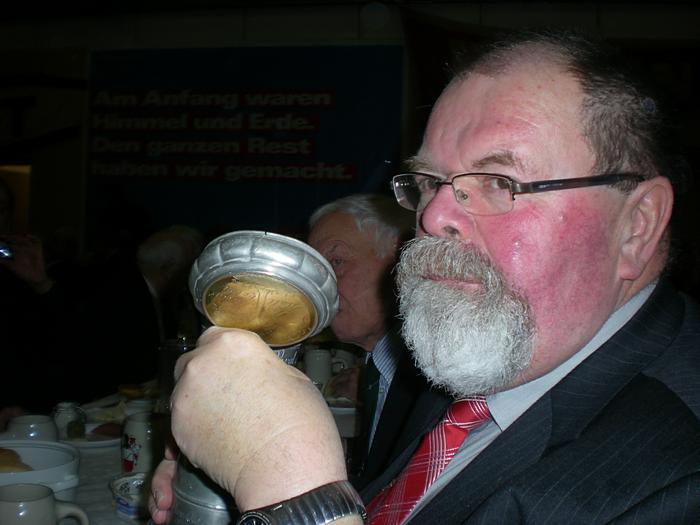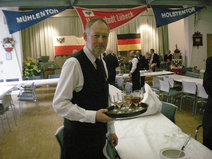Nach der Begrüßung durch den Ältermann der Gilde, Hartmut Haase kommen die Schaffer herein und decken das diesmal wieder selbst mitgebrachte Frühstück auf, das Braunbier steht schon auf dem Tisch. Endlich, der Hunger ist schon groß !! Schließlich gilt es ja eine deftige Grundlage für den anschließenden Genuss alkoholischer Getränke zu legen. Während dessen gibts ein Grußwort vom stellvertretenden Stadtpräsidenten Peter Sünnenwold. Auch er drückt seine Freude darüber aus, dass das traditionelle Frühstück nach dem Intermezzo im Jahre 2009 wieder von jedem nach eigenem Gusto gestaltet werden kann. Die jahrhunderte alte Tradition lebt also wieder..... Auch in diesem Jahr hat Peter Sünnenwold den Verdauer-Schnaps gestiftet, ein Produkt aus Lübeck-Krummesse. |