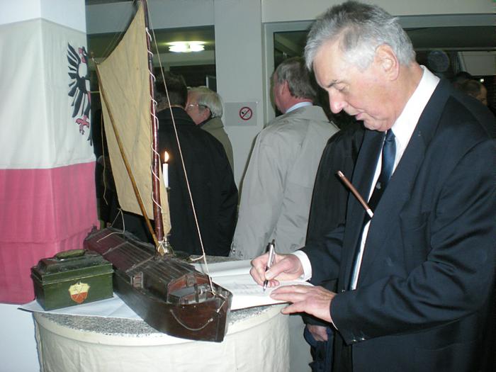 Eintragen ins Gästebuch - am Modell eines Stecknitzschiffes um 1900 (30 Meter, 35 Tonnen) |