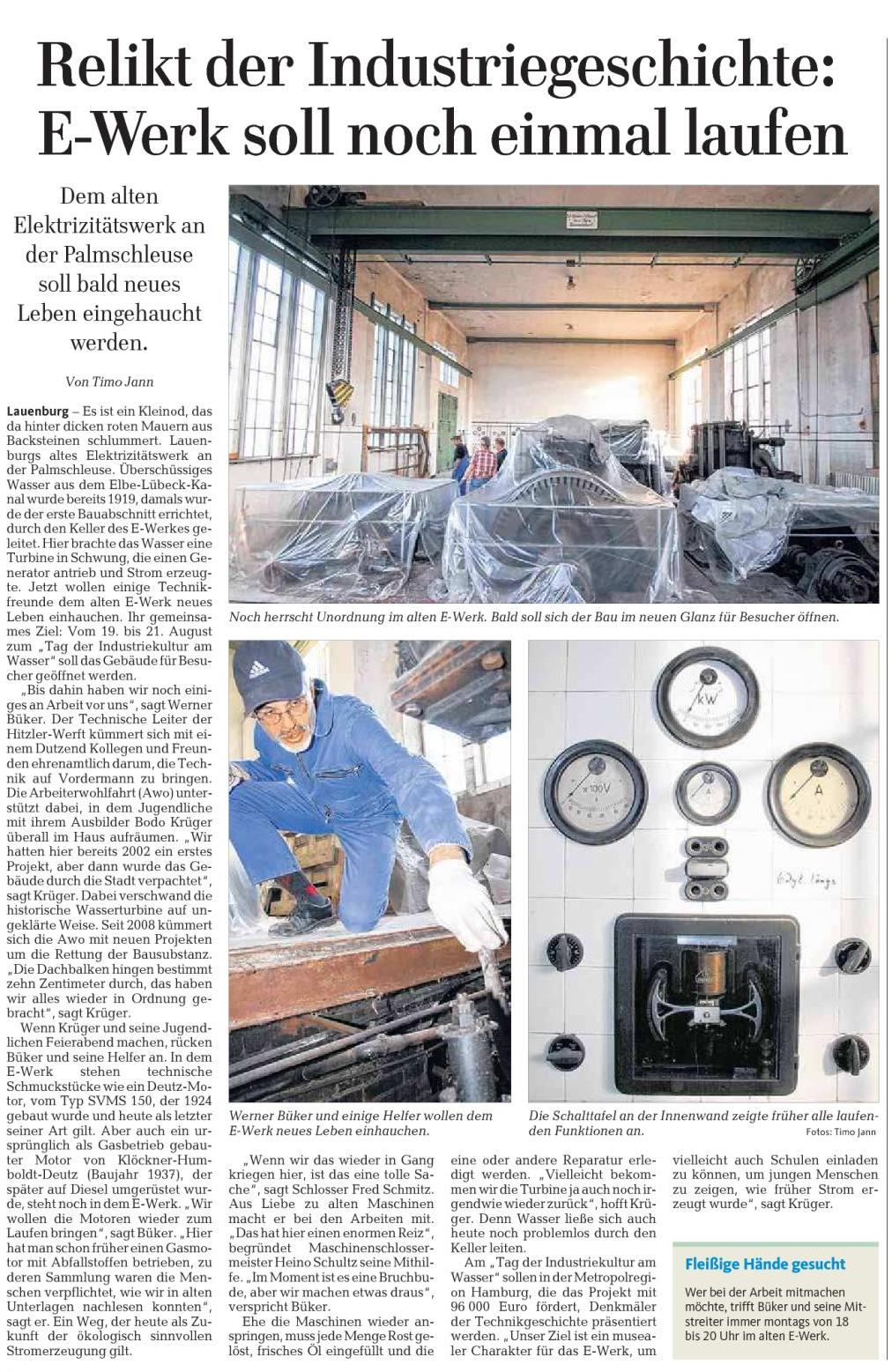 Ein Wasser- und Dieselmotorenkraftwerk aus den 1920er-Jahren zählt zu den nahezu unbekannten Attraktionen in Lauenburg. Es steht etwas abseits zwischen der modernen Schleuse des Elbe-Lübeck-Kanals und der alten Palmschleuse und trieb einst mit dem überschüssigen Wasser des Elbe-Lübeck-Kanals eine Turbine zur Stromerzeugung an. Schon vor dem Bau des Kanals hatte hier die Palmmühle die Wasserkraft zwischen der Stecknitz-Fahrt und der Elbe genutzt. Die Stadt Lauenburg kaufte die Palmmühle und baute daneben 1921 ein kleines Wasserkraftwerk mit einer Leistung von 70 Kilowatt. Der Strombedarf stieg sehr schnell. Deshalb erweiterte die Stadt die Anlage 1926 um ein Dieselmotorenkraftwerk und stellte vier Maschinensätze mit 150, 200, 330 und 345 PS auf. Motoren von Deutz trieben hier die großen Generatoren an. 1936 wurde die Anlage im Rahmen der Autarkiebestrebungen des Dritten Reiches um einen Raum für einen Drehrostgenerator erweitert. Er erzeugte aus Steinkohle das Gas für zwei der Motoren. Seit 1974 ist das E-Werk außer Betrieb. Die denkmalgeschützten roten Backsteingebäude im Stil er Neuen Sachlichkeit aber blieben mit der Technik nahezu vollständig erhalten.
