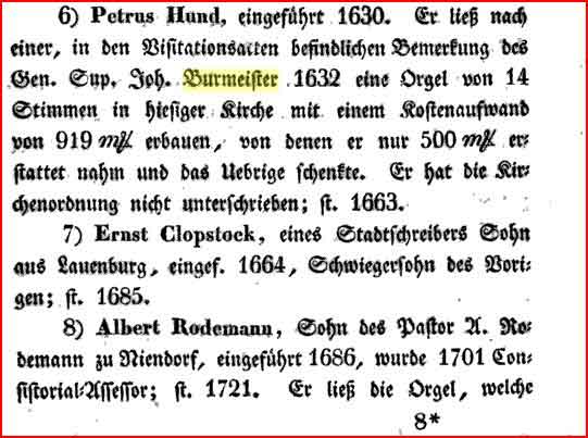 ließ 1632 eine Orgel für 919 Mark Lübsch (Lübeck) erbauen, schenkte der Kirche davon 419 Mark (s.a. "Visitationen") , starb 1663 |