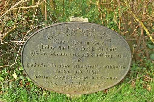 Hier ruhet in Gott : Pastor Carl Friedrich Bischoff, geb. im Februar 1780, gest. den 9. März 1855 und Pastorin Dorothea Margaretha Elisabeth Bischoff, geb. Scheel, geb. im August 1755, gest. de. 3. Februar 1847 ? |