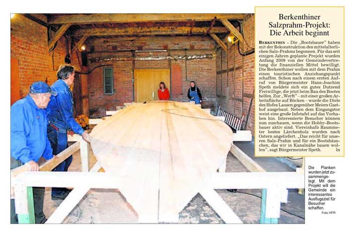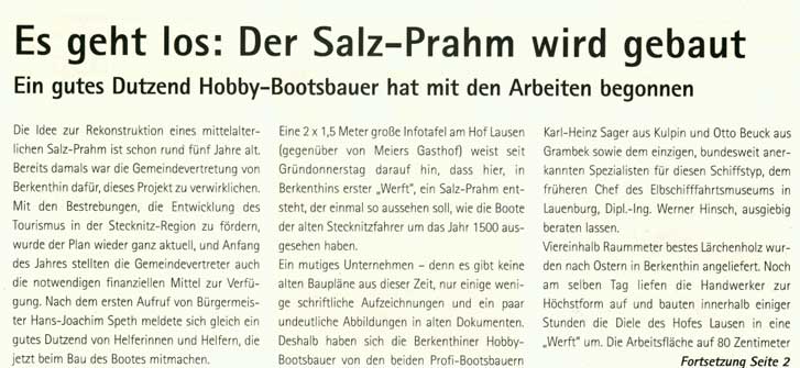 Der Beauftragte der Stecknitz-Region des Amtes Berkenthin, Rolf Peter Frischmann, hatte im Jahre 2004 die Idee die wechselvolle Geschichte der Stecknitzfahrt auf besondere Art und Weise wieder auf leben zu lassen : durch die Rekonstruktion eines mittelalterlich Salzprahms. Es gelang ihm den Bürgermeister der Ortes, Hans-Joachim Speth, dafür zu gewinnen. Im Jahr 2009 war es dann soweit, im April begann der Bau in einer Scheune gegenüber von Meiers Gasthof.