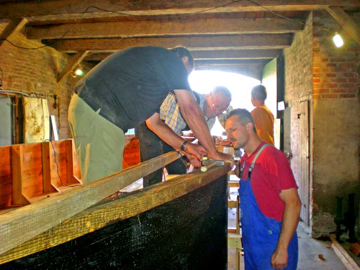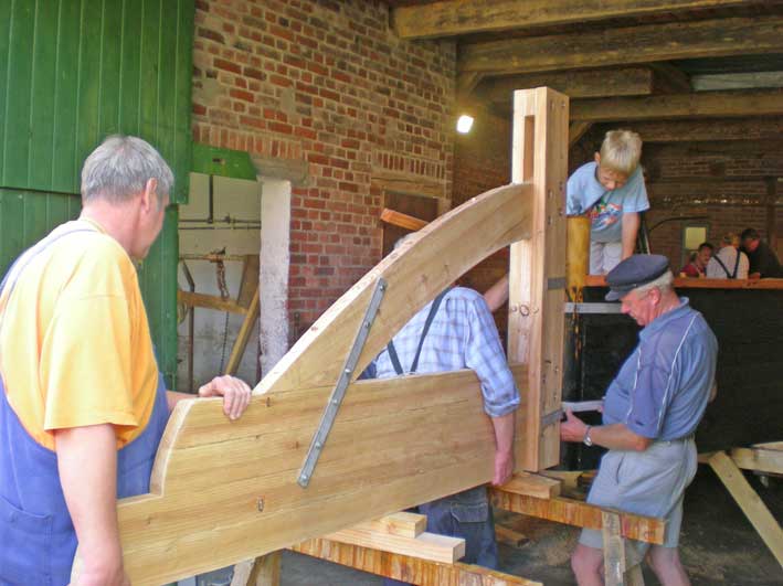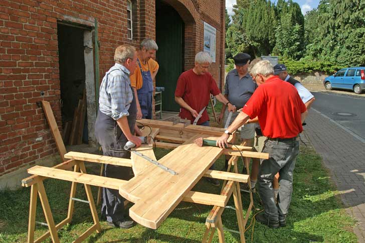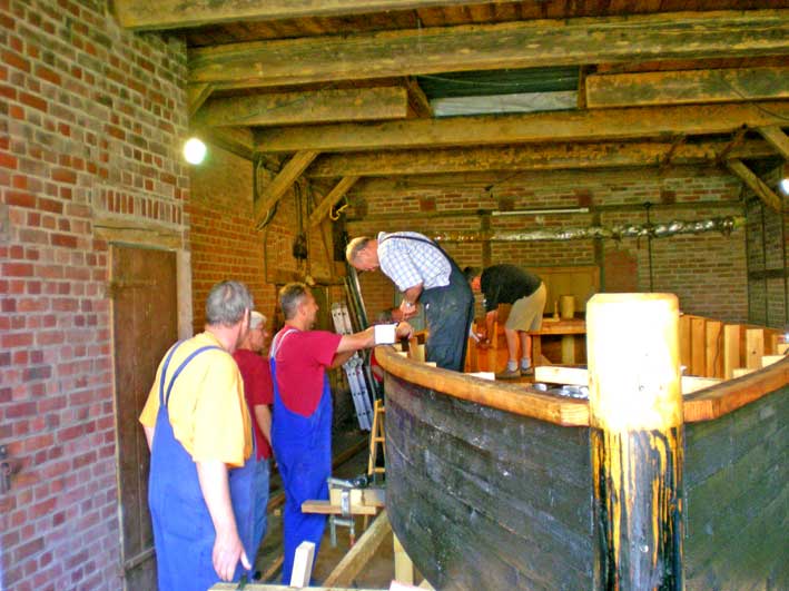 Seit April 2009 kommen jeden Samstag folgende "Bootsbauer" zwischen 09.00 - 16.00 Uhr und opfern begeistert ihre Freizeit für dieses Projekt : Gerald Vollstedt, Friedrich Macke und Enkel Tobias (10), Detlef Grimm, Regina Ashraf-Heinrich, Karl-Heinz Karnatz, Kurt Früchting, Norbert Schmidt, Günter Schewe, Joachim Krähe und Heinrich Strahlendorf. Berater Bootsbauer Otto Beuck, Gisela Bockholt und natürlich immer wieder Bürgermeister Speth. Jetzt im August 2009 nähert sich der Bau dem Ende. Sie veranschlagen ca 1000 Arbeitsstunden, die investiert werden mussten.