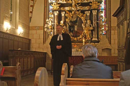 Pastor Runge bei seinen einleitenden Worten - noch schwebt der Tauf-Engel in lichter Höhe |