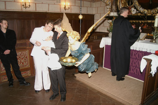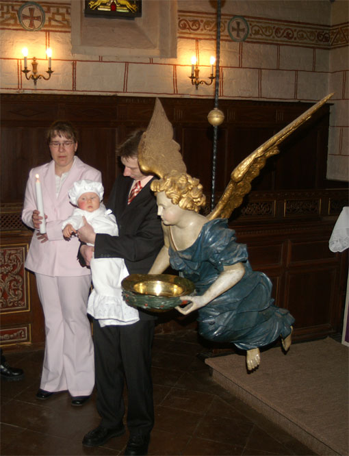 Zu dieser Gelegenheit wurde der vor dem Altar in zwei Meter Höhe schwebende Tauf-Engel auf die passende Höhe abgesenkt. Dies lässt sich leicht bewerkstelligen, da der Engel mit einem Feldsteingegengewicht in jeder Lage in der Schwebe gehalten wird.